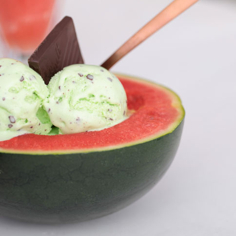 Serve scoops in half Melonballs, topped with a piece of chocolate.
